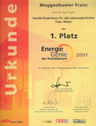 Am 01.03.07 wurde uns der Branchen-Oscar, der Energiegenie der Installateure für das Projekt Kombipassivhaus Meier in Neuhofen im Innkreis verliehen. Wir haben in diesem 256 qm grossen Gebäude Energiekosten von unter 500 Euro im Jahr für Heizung, Lüftung, Warmwasser und Strom! Dieser Preis ist die Auszeichnung für das innovativste Installationsunternehmen 2007!