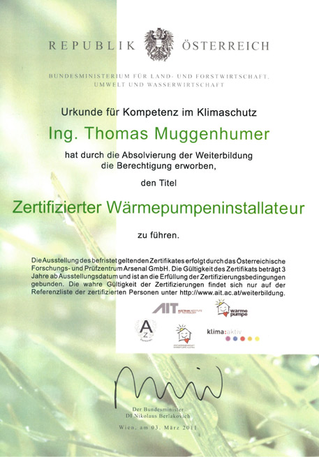 Seit 02.03.2011 ist Thomas Muggenhumer berechtigt, den Titel Zertifizierter Wärmepumpeninstallateur zu führen.