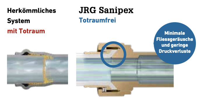 JRG Sanipex ist ein Rohr-in-Rohr-System aus Kunststoff — bestens geeignet für Ihre Trinkwasserinstallation. Die Bördelklemmverbindung ermöglicht eine sichere und totraumfreie Verbindung mit vollem Durchfluss.