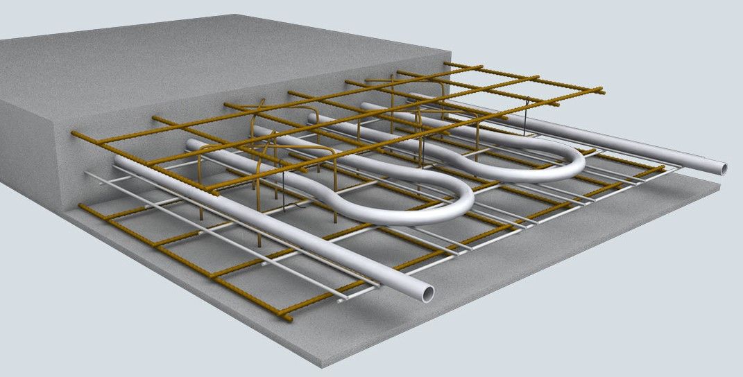 Durch die Verlegung von BKA Rohre mit 20 mm Durchmesser auf der ersten Bewehrungsebene oder in der Mittellage kann die Masse der Betondecke als Speicher genutzt werden.