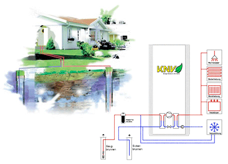 Das Grundwasser wird vom Förderbrunnen zur Wärmepumpe und von dort zum 15 Meter entfernten Sickerbrunnen geführt. Aufgrund der sehr hohen und konstanten Grundwasser-Temperaturen kann mit dieser Art der Umweltwärmenutzung ein sehr hoher Wirkungsgrad erzielt werden. Der Brunnen ist nicht nur Energielieferant für die Wärmepumpe sondern kann auch kostengünstig Wasser für die Gartenbewässerung liefern.